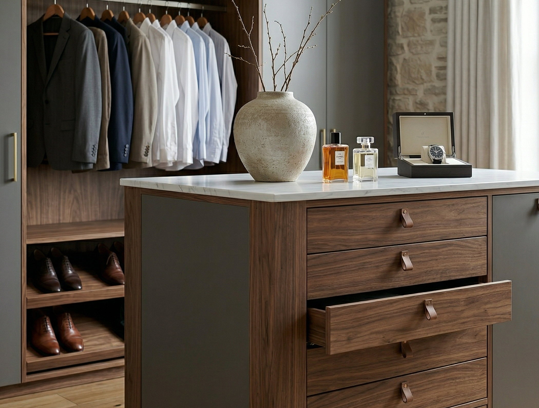 Giyinme odası için kullanışlı bir çalışma yüzeyine sahip merkezi bir ada.