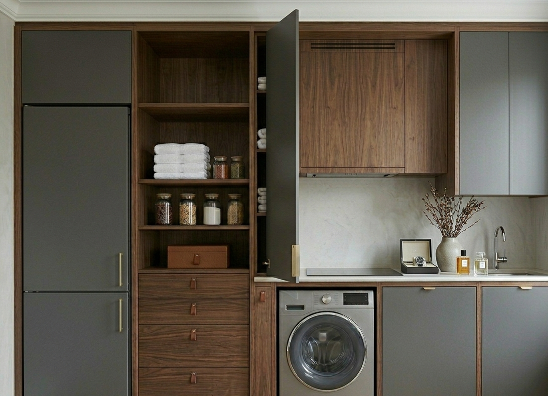 Ankastre buzdolabınız için özel yapım saklama dolabı, ayrıca ek çamaşır makineleri için de yer mevcuttur.