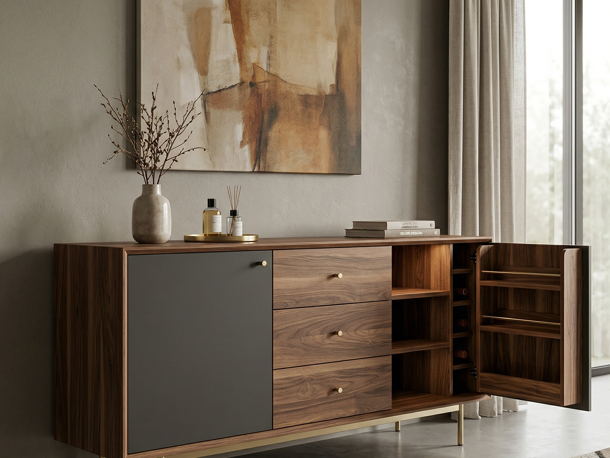 İşlevsel ve şık bir duvar düzenlemesi için tavana kadar uzanan iki dolap arasına yerleştirilmiş alçak dolap.