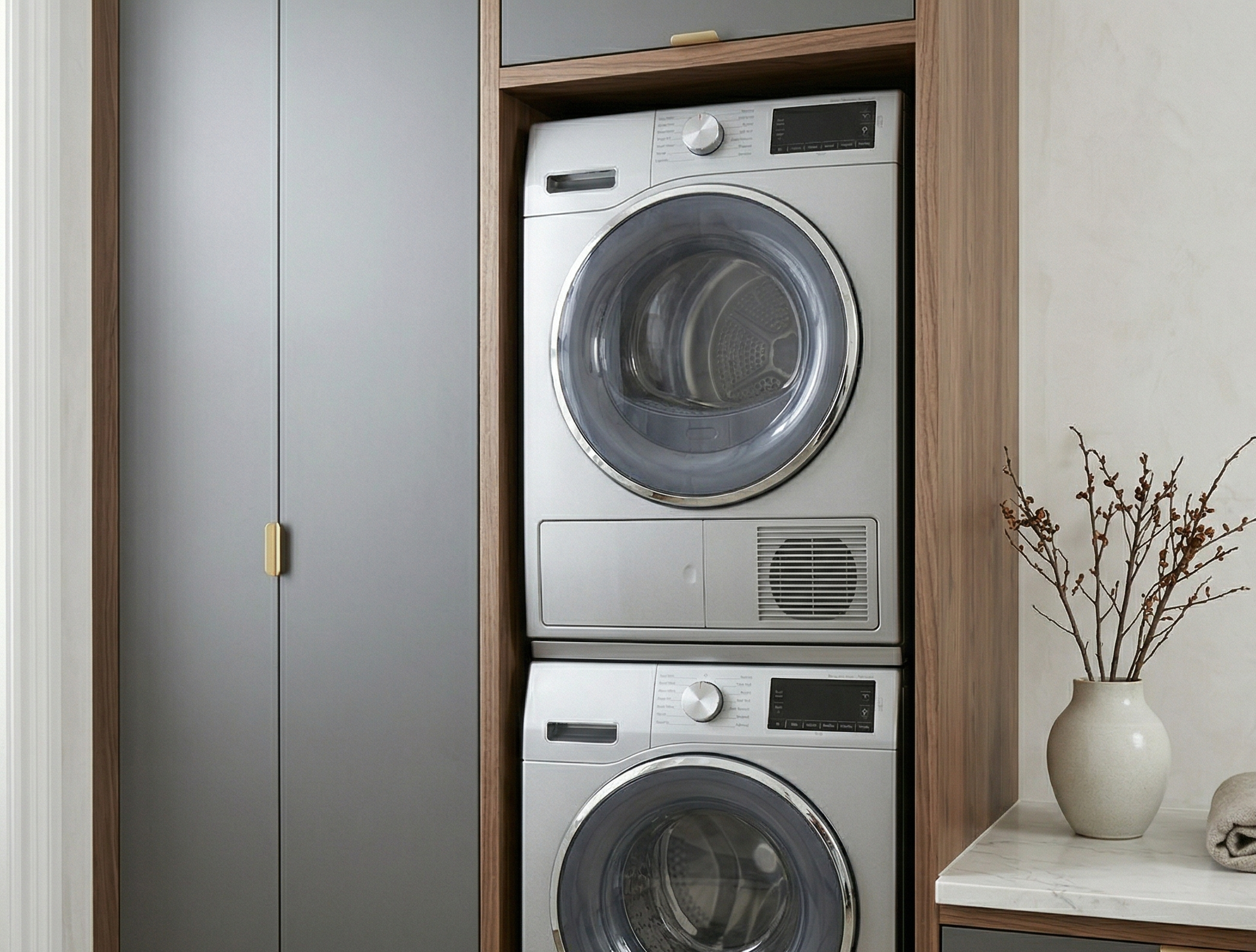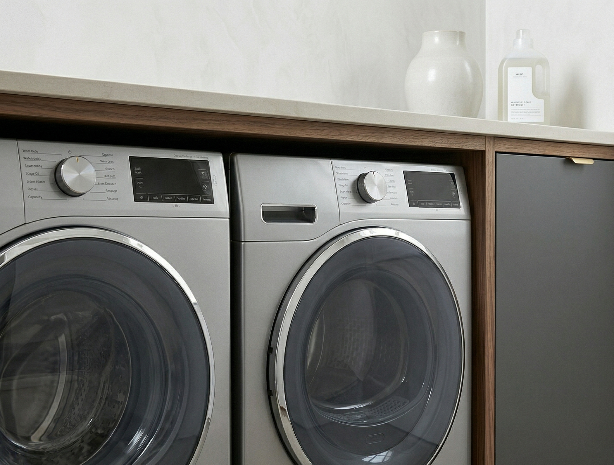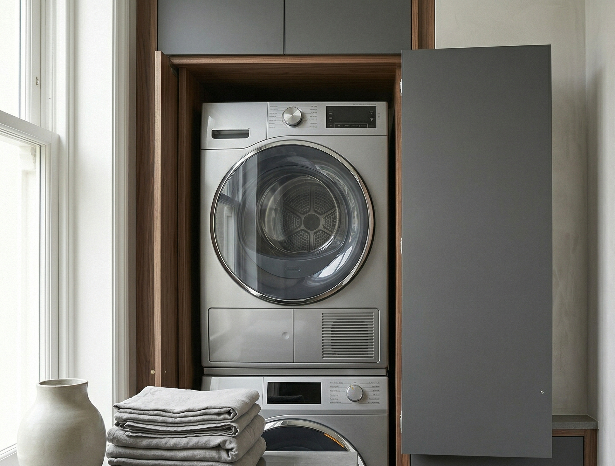 Tezgahın altında çamaşır makinesi ve/veya kurutma makinesi bulunan dolap ve yanında isteğe bağlı depolama alanı.