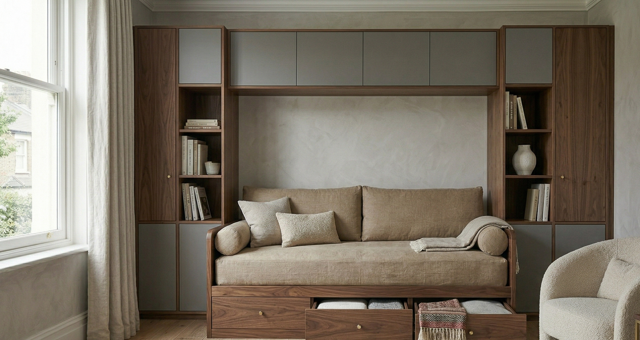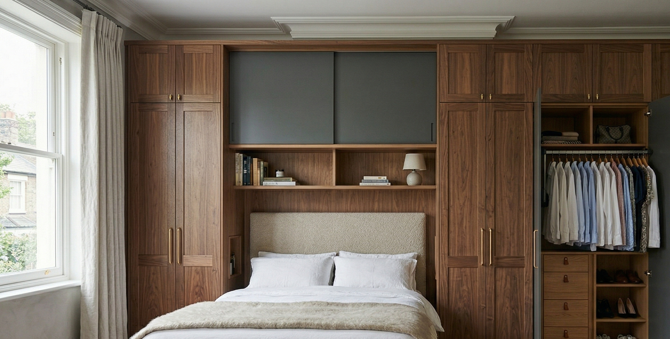 Birlikte köprü görevi gören dolapların birleşimi, yatak üstü veya geçit için idealdir.