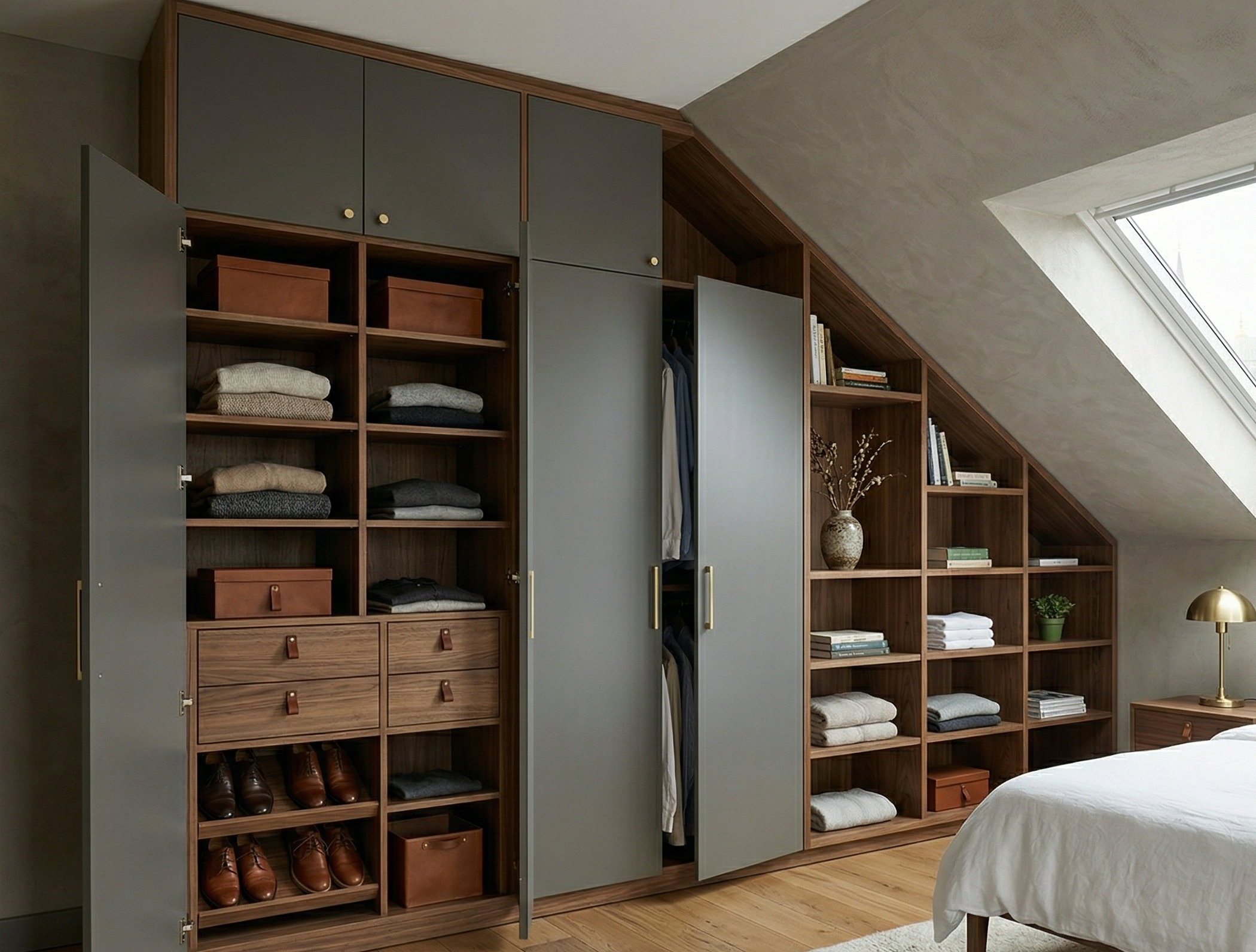 Çatı eğiminize mükemmel şekilde uyacak şekilde, arkası veya yanları eğimli, özel yapım dolap.