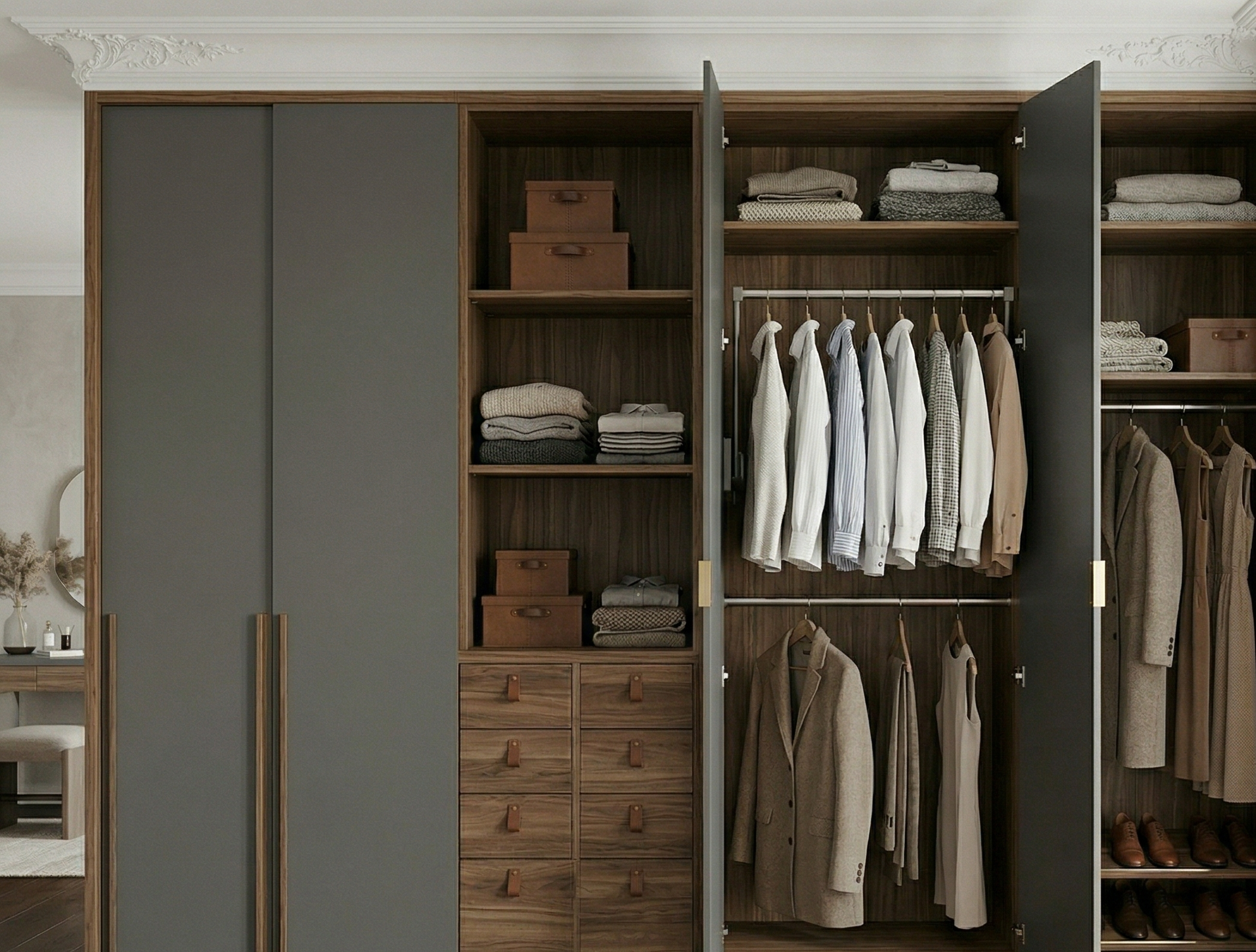 Şık bir tasarımda alçak dolap ve tavana kadar uzanan dolabın birleşimi.