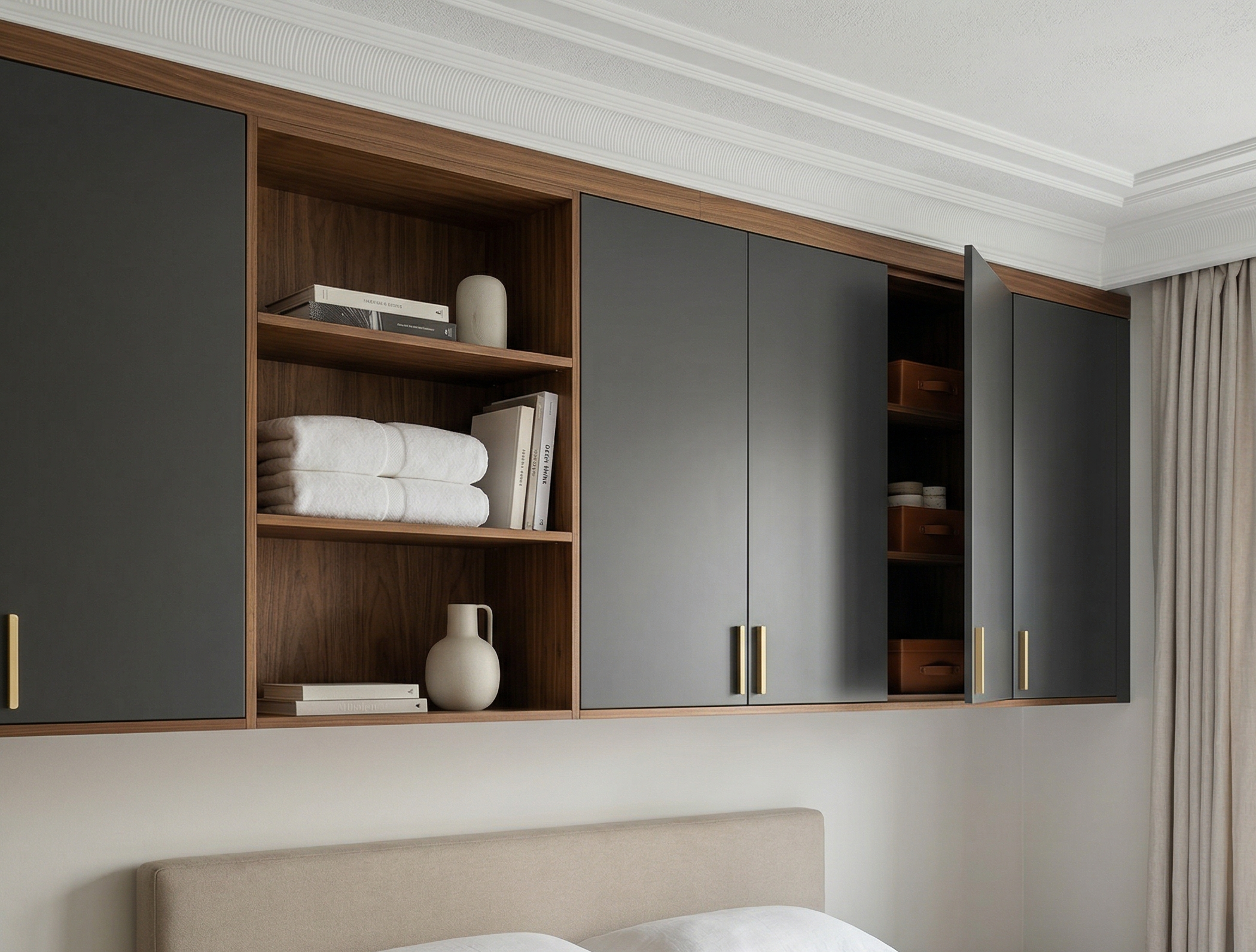 Duvarın üst kısmında ek depolama alanı sağlayan, tavana monte edilmiş dolap.