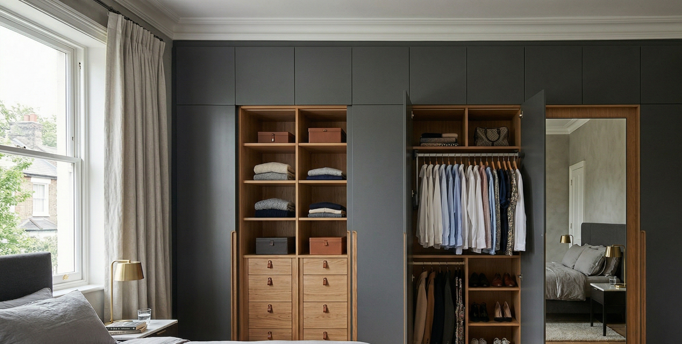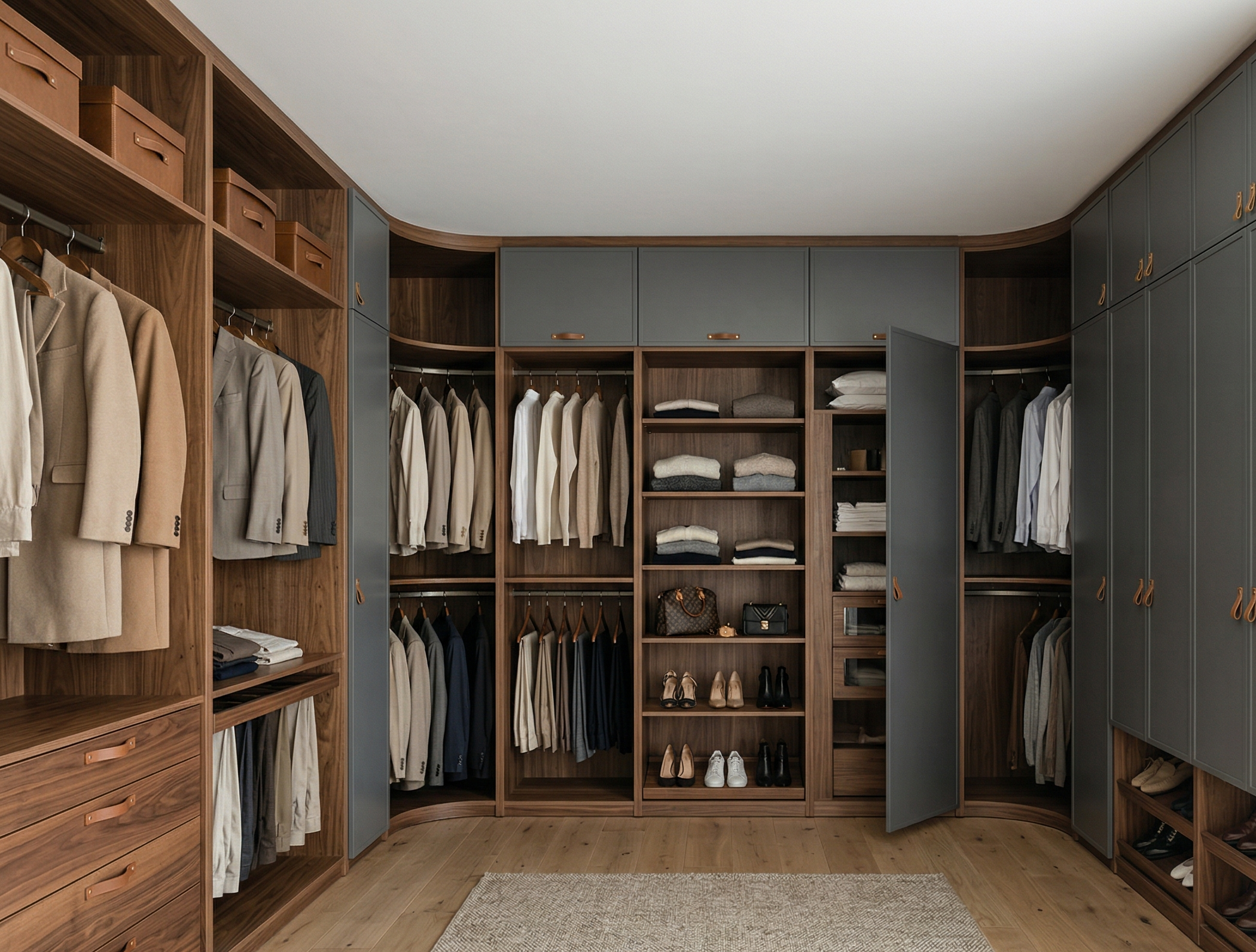 Üç duvarı kaplayan, iki köşeden en iyi şekilde yararlanan özel yapım dolap.