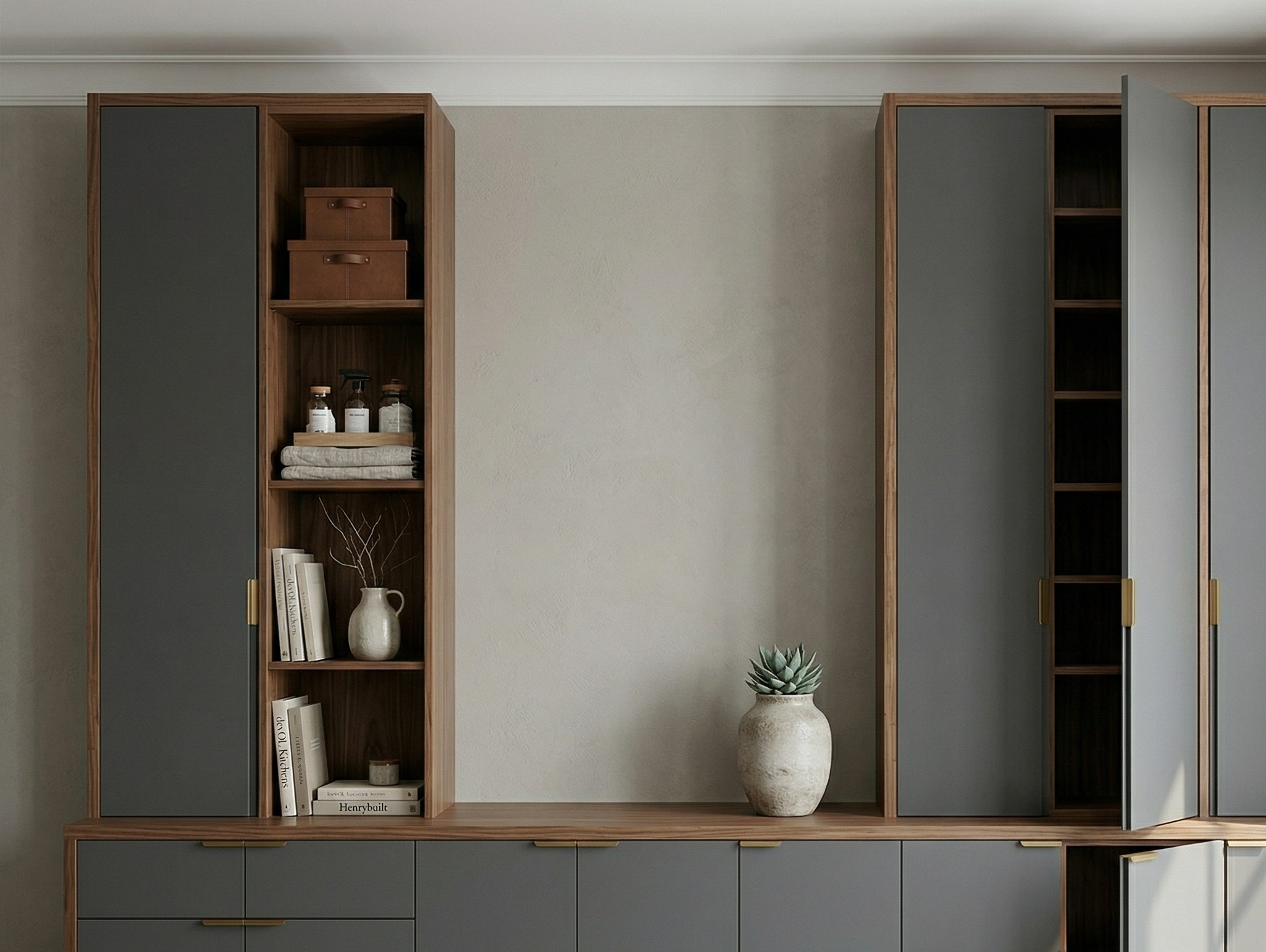İşlevsel ve şık bir duvar düzenlemesi için tavana kadar uzanan iki dolap arasına yerleştirilmiş alçak dolap.